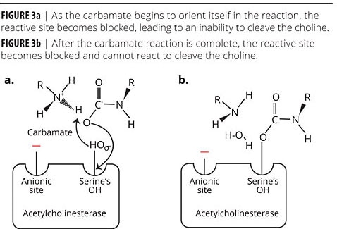 This reaction may easily be observed using Ellman’s reagent. Thiocholine reacts with the chromogen (Ellman’s reagent, also called coloring agent) and turns yellow. If the cholinesterase is exposed to a sample containing a carbamate compound, the carbamate aligns itself with the cholinesterase due to the different polarities at specific active sites within the cholinesterase attracting the oppositely charged sites of the carbamate salt (Figure 3a). The spatial arrangement assists in the reaction of the serine OH from the cholinesterase active site with the carbamate blocking the cholinesterase activity (Figure 3b), thereby preventing the enzyme from reacting with acetylcholine. This phenomenon is referred to as cholinesterase inhibition.