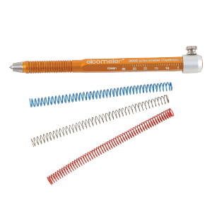 Each Elcometer 3092 Sclerometer Hardness Tester is supplied in a case with a 0.75mm (0.03”) diameter tungsten carbide tip and 3 springs (grey, red and blue). An optional green spring of 0 - 30N is also available.