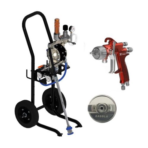 Package ContentsElcometer Kara 1-40 Trolley & Wall Mount Double Diaphragm Air Spray Pump supplied with Sagola X4100 Pressure Spray Gun, XT01B Aircap - 1.20 Needle & Nozzle Kit